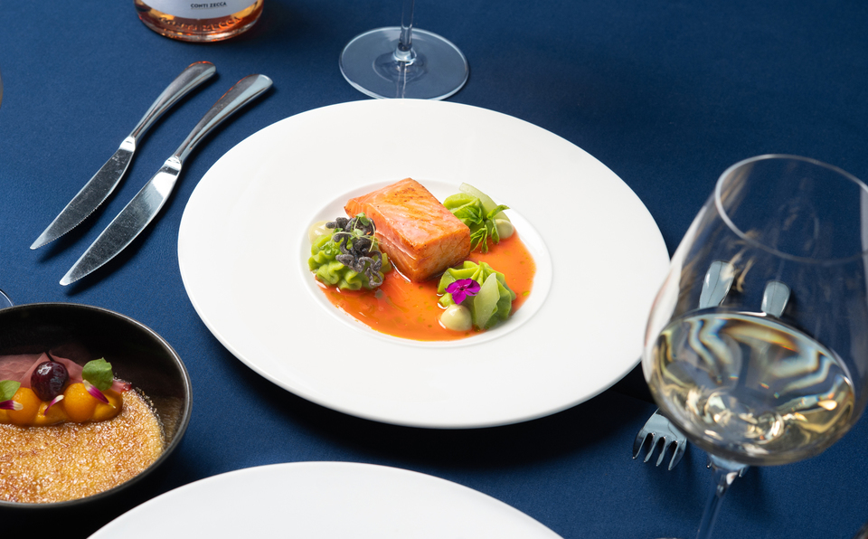 • MARINOVANÝ LOSOS LABEL ROUGE, brokolicové pyré, nakládaná okurka, avokádo, omáčka z červeného grepu